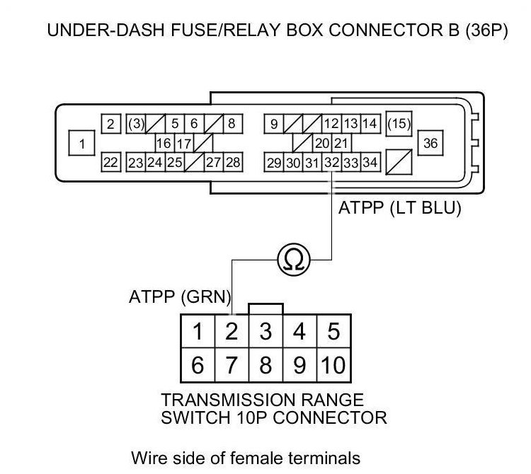 21. Check for continuity between under-dash fuse/relay box connector B (36P) terminal No. 32 and transmission range switch 10P connector terminal No. 2.