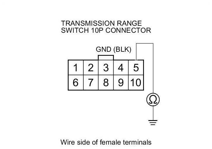 22. Check for continuity between transmission range switch 10P connector terminal No. 5 and body ground.