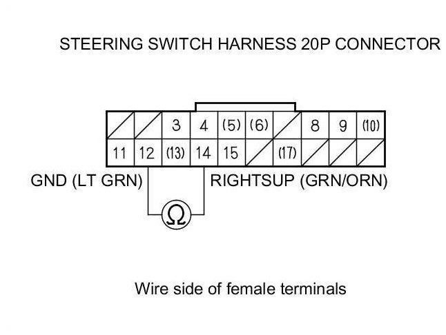 2. Check for continuity between steering switch harness 20P connector terminals No. 12 and No. 14 while pressing the paddle shifter + (upshift switch) and when the paddle shifter + is released.