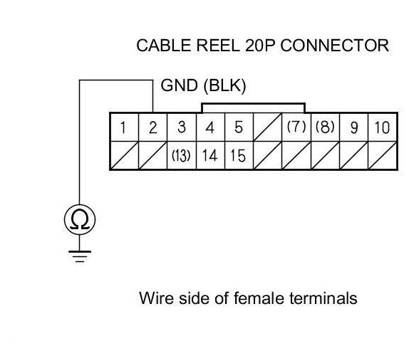 6. Check for continuity between cable reel 20P connector terminal No. 2 and body ground.