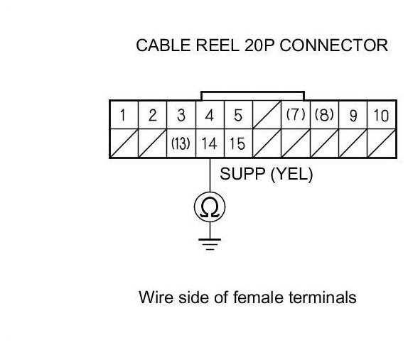 9. Check for continuity between cable reel 20P connector terminal No. 14 and body ground.