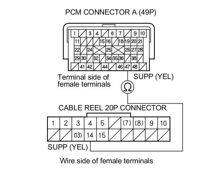 10. Check for continuity between PCM connector terminal A47 and cable reel 20P connector terminal No. 14.