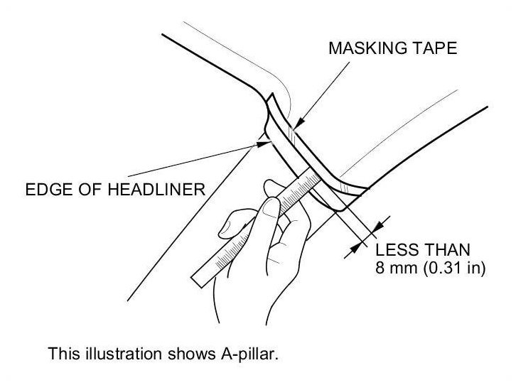 To prevent the side curtain airbag from deploying and damaging the pillar trim, the overlap between the headliner and pillar trim must be less than 8 mm (0.3 in). To check the overlap, do this: