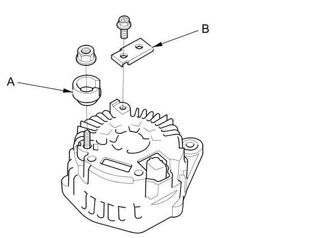 17. Remove the voltage regulator/brush holder assembly (A) and the rectifier (B).
