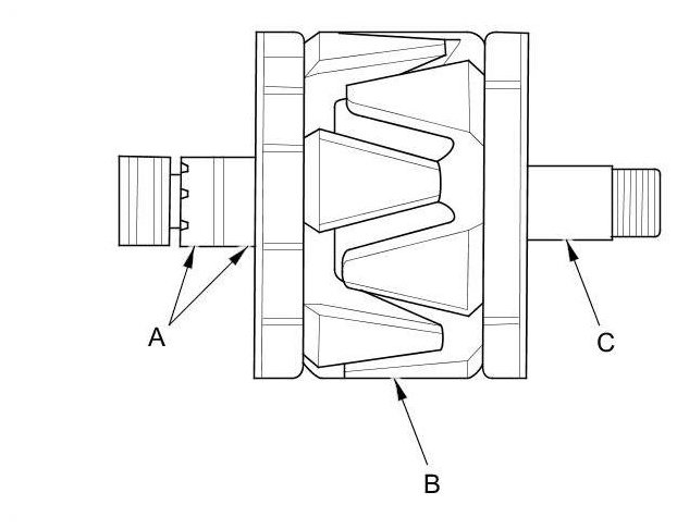22. Check for continuity between each slip ring and the rotor (B) and the rotor shaft (C):