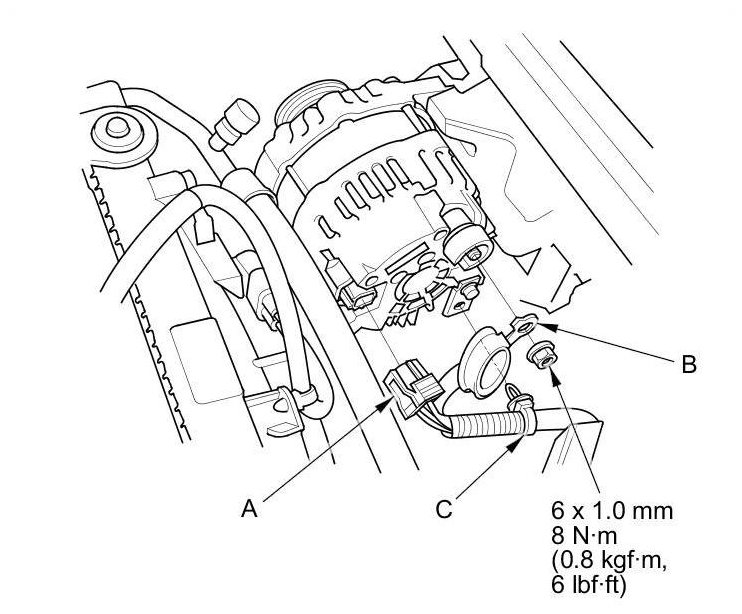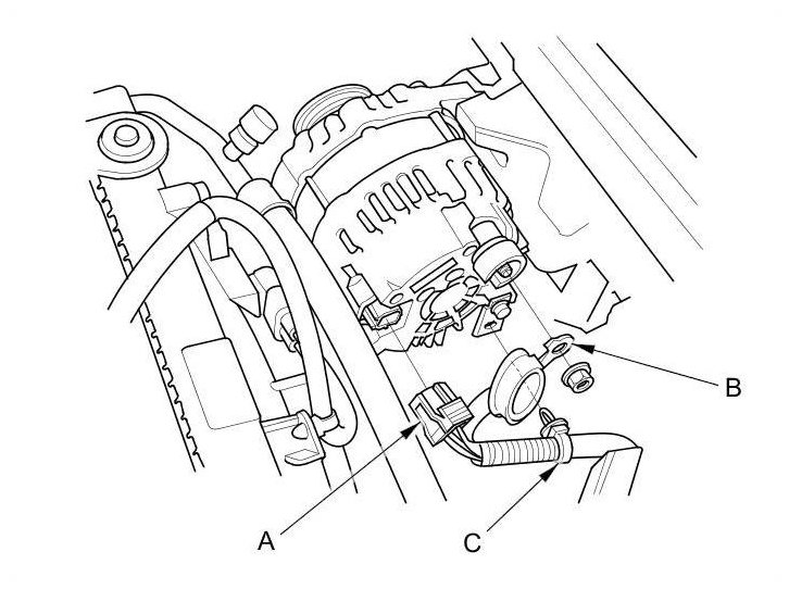 4. Disconnect the alternator connector (A) and the positive alternator cable (B), then remove the harness clamp (C) from the alternator.