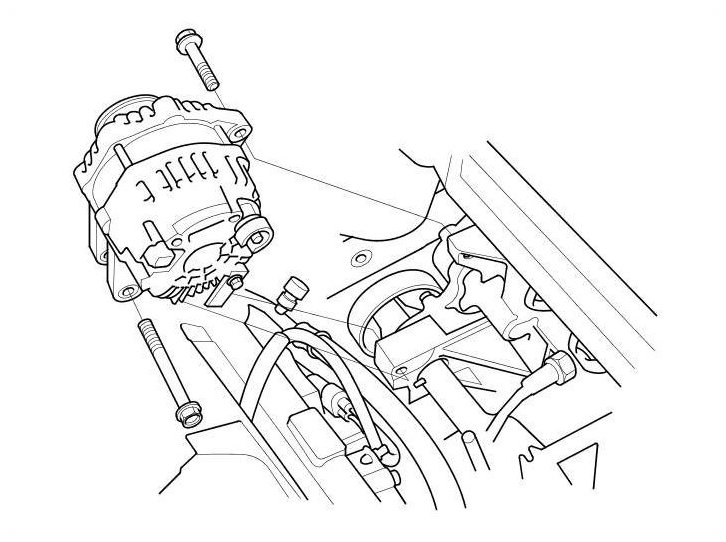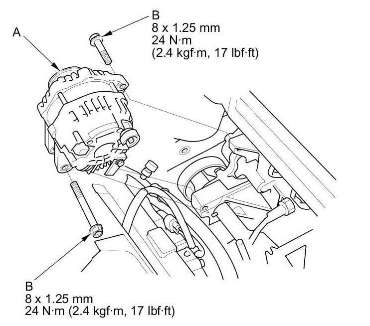 1. Install the alternator (A), then tighten the alternator mounting bolts (B).