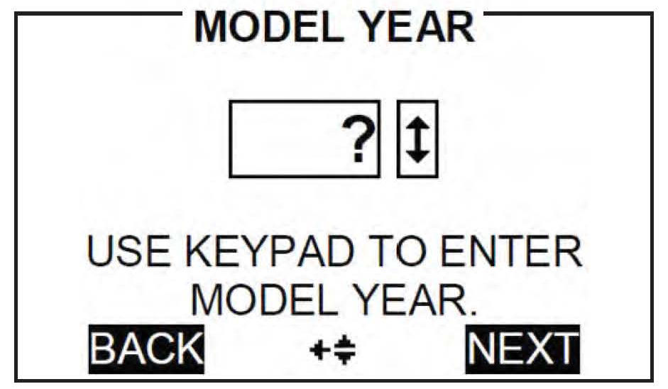 9. Scroll up or down to select the model year of the vehicle being tested, and press NEXT to continue.