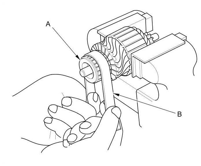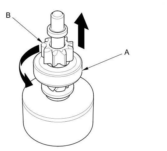 16. Hold the drive gear (B), and turn the overrunning clutch in the direction shown to make sure it turns freely. Also make sure the overrunning clutch locks in the opposite direction. If it does not lock in either direction or it locks in both directions, replace it.
