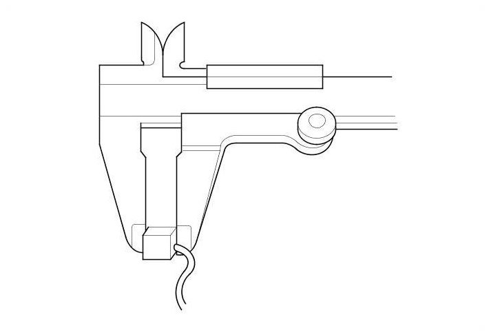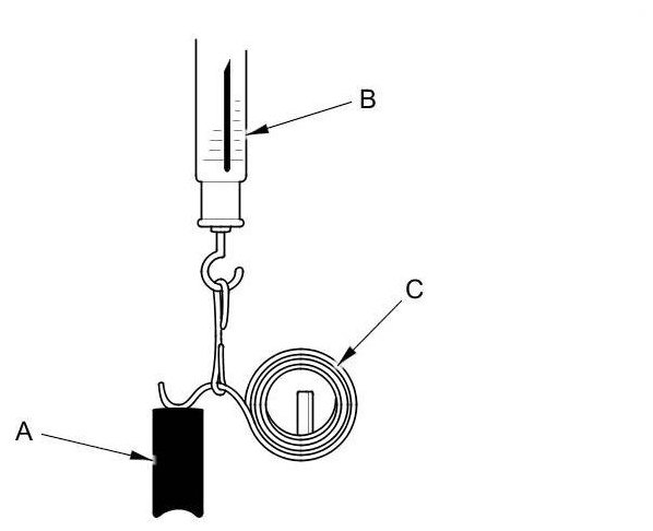 14. Insert the brush (A) into the brush holder, and bring the brush into contact with the commutator, then attach a spring scale (B) to the spring (C). Measure the spring tension at the moment the spring lifts off the brush. If it is not within the standard, replace the brush holder assembly.