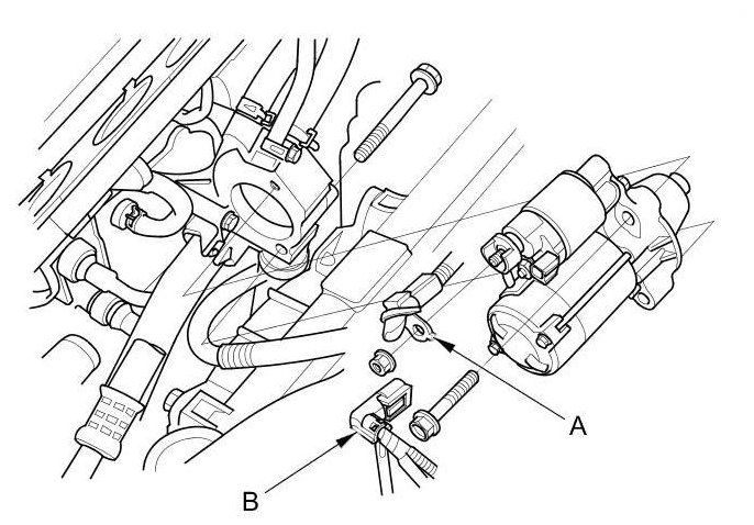 6. Disconnect the positive starter cable (A) and the S terminal connector (B).