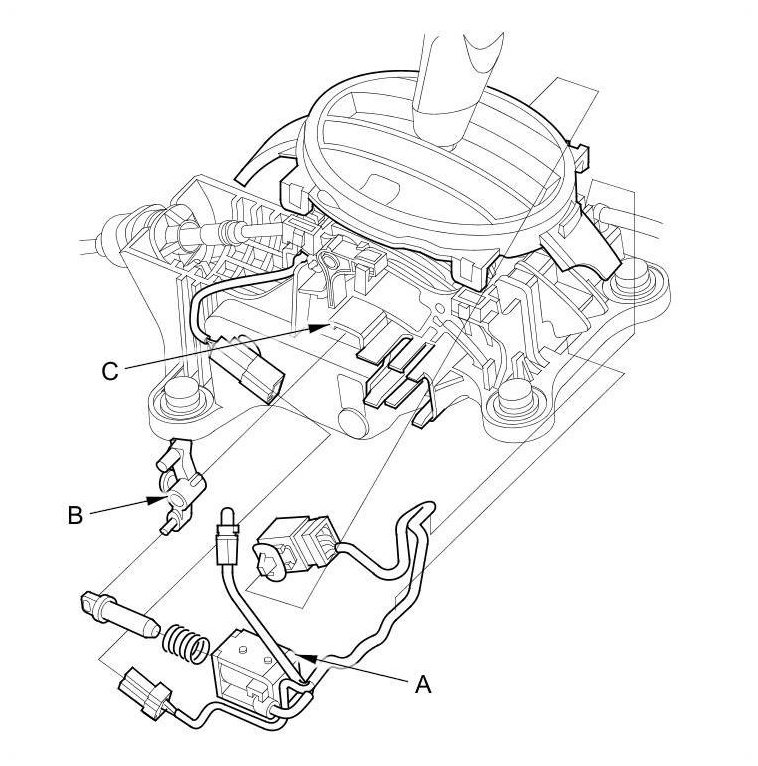4. Apply silicone grease to the pin (C) on the shift lever bracket base, and install the shift lock stop over the pin. Keep the connector terminals free of silicone grease.