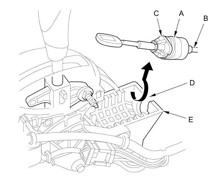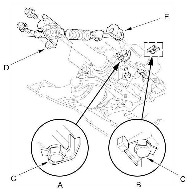 6. Rotate the socket holder (A) on the shift cable (B) a quarter turn; the corner (C) on the socket holder will be in the opening (D) of the shift lever bracket base (E). Then slide the holder to remove the shift cable from the bracket.