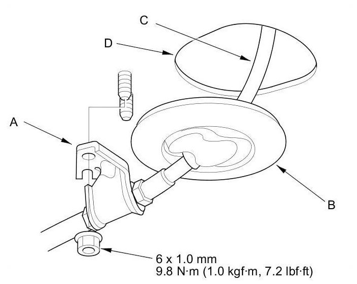 13. Insert the new shift cable through the grommet hole (D), and install the grommet in its hole. Do not bend the shift cable excessively.