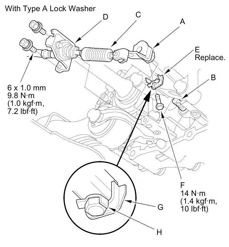 - With type A lock washer: Install the flange (G) of the lock washer facing the transmission housing as shown, then bend the lock tab (H) of the lock washer against the bolt head securely.
