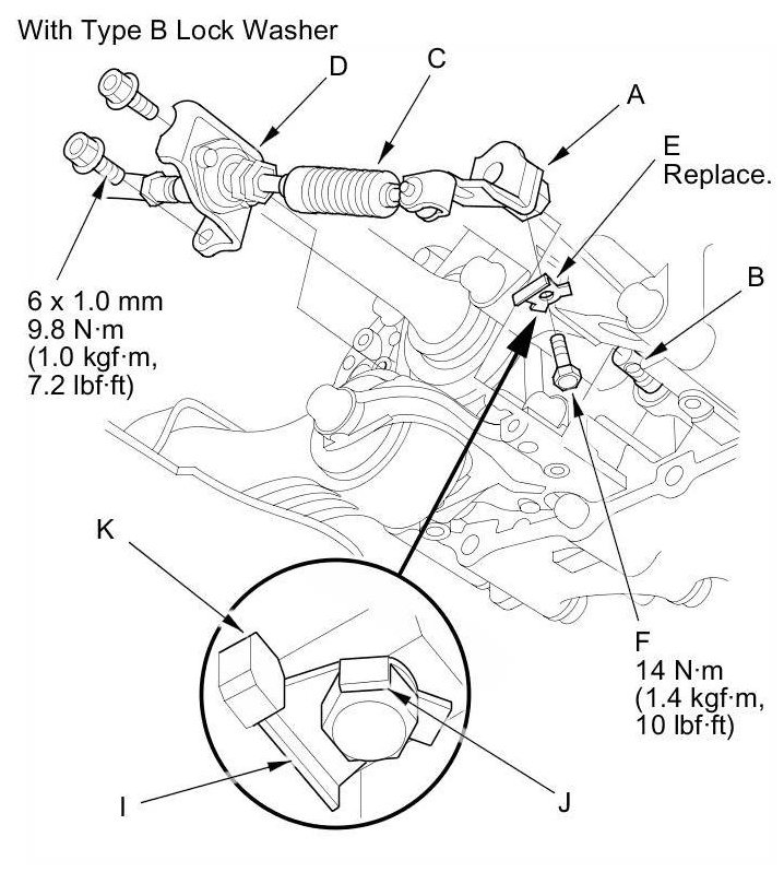 - With type B lock washer: Install the flange (I) of the lock washer facing the control lever as shown, then bend the lock tab (J) of the lock washer against the bolt head securely. Do not ride the lock washer on the stop (K) on the control lever.