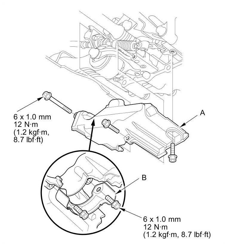19. Install the shift cable cover (A). If the shift cable cover protector (B) was removed, install the shift cable cover protector on the shift cable cover, then install the shift cable cover.