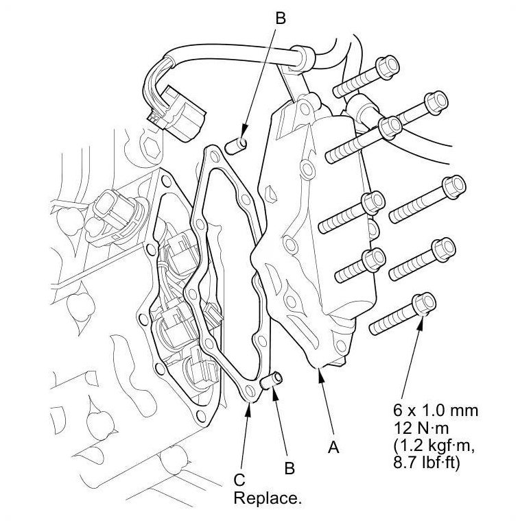 8. Remove the shift solenoid valve cover (A), the dowel pins (B), and the gasket (C).