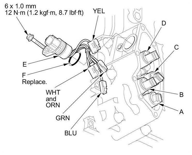 10. Install a new O-ring (F) on the new shift solenoid harness connector, and install the connector in the transmission housing.