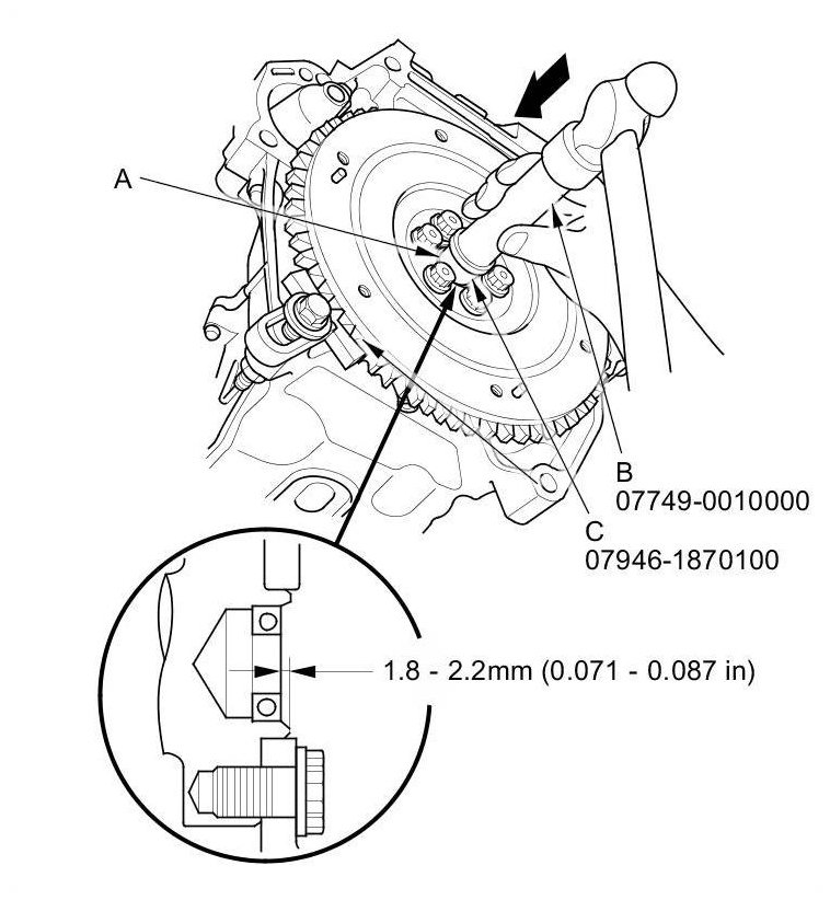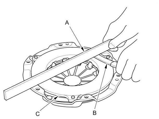 7. Inspect for warpage using a precision straight edge (A) and a feeler gauge (B). Measure across the pressure plate (C). If the measurement is greater than the service limit, replace the pressure plate.