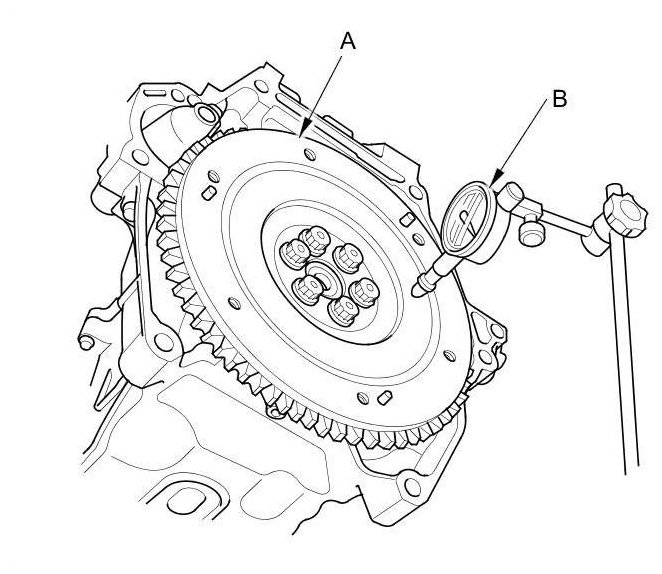 15. Measure the flywheel (A) runout using a dial indicator (B). Through at least two full turns with pushing against the flywheel each time you turn it to take up the crankshaft thrust washer clearance. If the measurement is more than the service limit, replace the flywheel, and recheck the runout. Go to step 16.