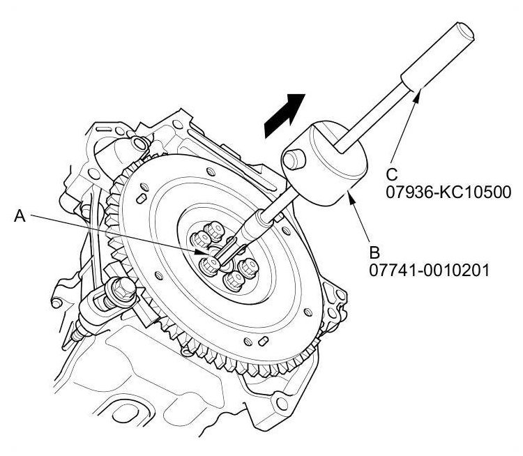 8. Remove the clutch disc (A), the remover handle (B), and the clutch alignment shaft (C).