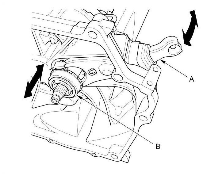 9. Move the release fork (A) right and left to make sure that it fits properly against the release bearing (B), and that the release bearing slides smoothly.