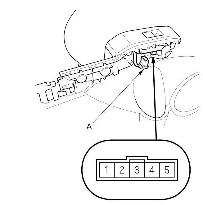 2. Disconnect the 5P connector (A) from the passenger's window switch.