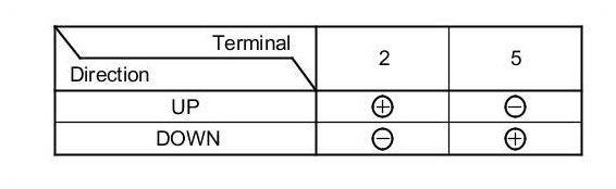 2. Test the motor in each direction by connecting battery power and ground to the rear power window switch 5P connector (A) according to the table.