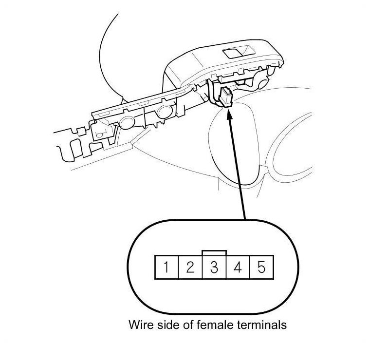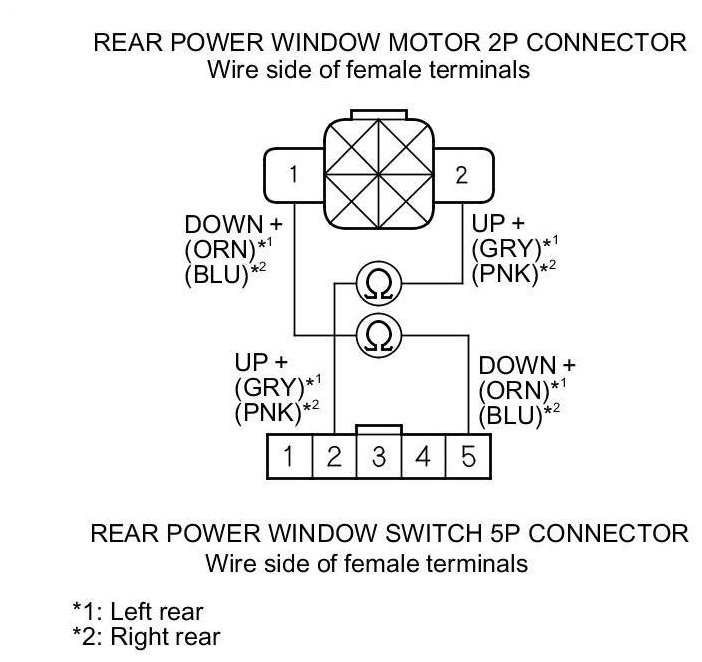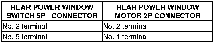 6. Check for continuity between rear power window switch 5P connector terminals No. 2 and No. 5 and rear power window motor 2P connector terminals No. 1 and No. 2 respectively. There should be continuity.