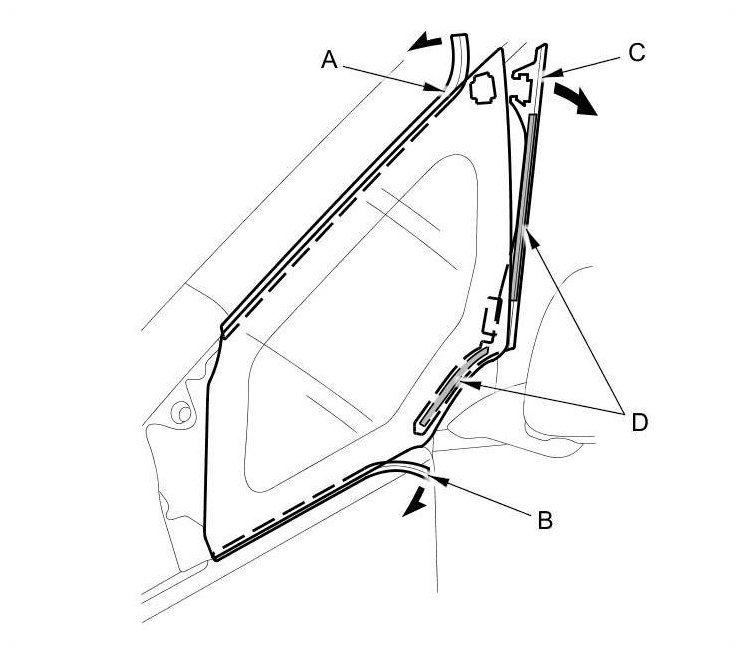 11. Attach seals A and B to the inside face of the quarter glass trim (C). Be sure the top edges of the seals line up with the alignment lines (D) on the trim as shown.