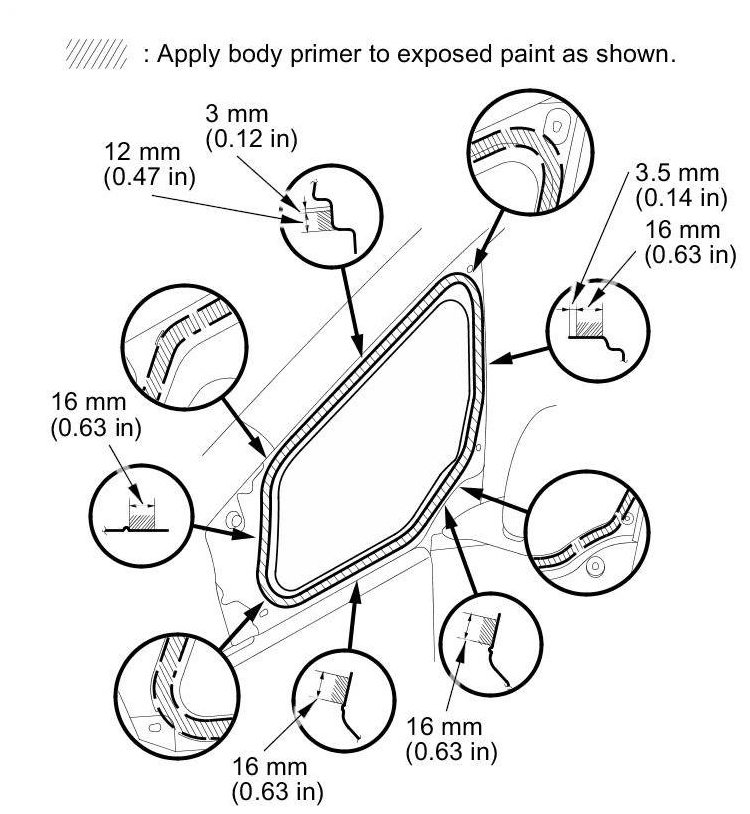 15. Apply a light coat of body primer to any exposed paint or metal around the front corner glass mounting flange. Let the body primer dry for at least 10 minutes: