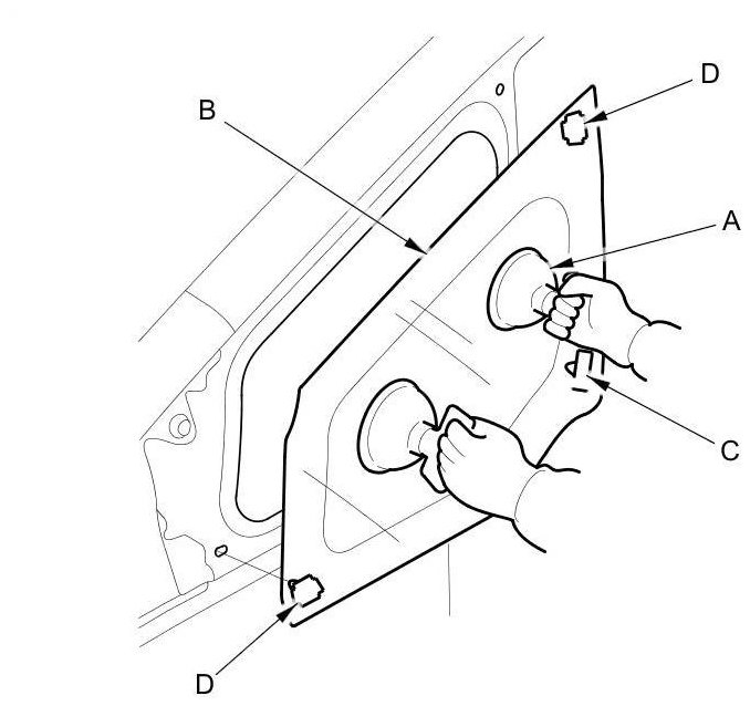 2. Pull out the lower edge of the front corner trim while detaching it from the adhesive (D), then remove it.