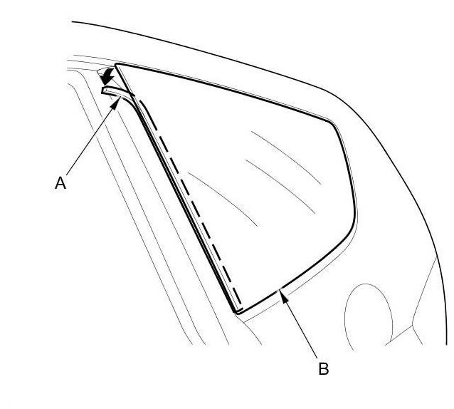 2. Remove the rubber dam (A) from the front edge of the quarter glass (B). If necessary, cut the rubber dam with a utility knife.