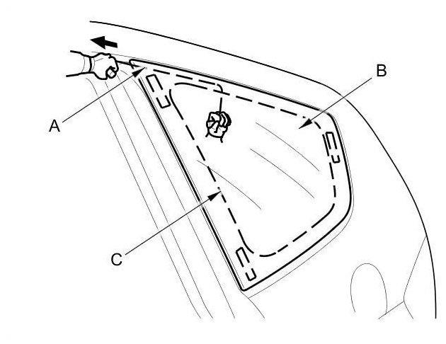 4. With a helper on the outside, pull the piano wire (A) back and forth in a sawing motion. Hold the piano wire as close to the quarter glass (B) as possible to prevent damage to the body, and carefully cut through the adhesive (C) around the entire quarter glass.