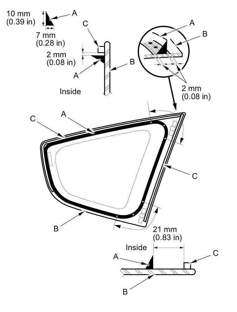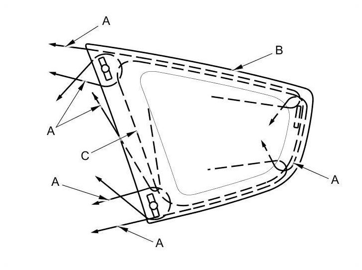 15. Put the cartridge in a caulking gun, and run a continuous bead of adhesive (A) around the edge of the quarter glass (B) and along the rubber dams (C) as shown. Apply the adhesive to the corner portions of the quarter glass, using the printed dots on the glass as a guide. Apply the adhesive within 30 minutes after applying the glass primer. Make a slightly thicker bead at each corner.