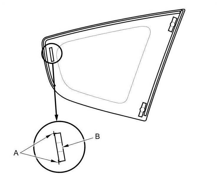 12. Apply a light coat of glass primer along the edge of the quarter glass (A) and rubber dams (B) as shown, then lightly wipe it off with gauze or cheesecloth: