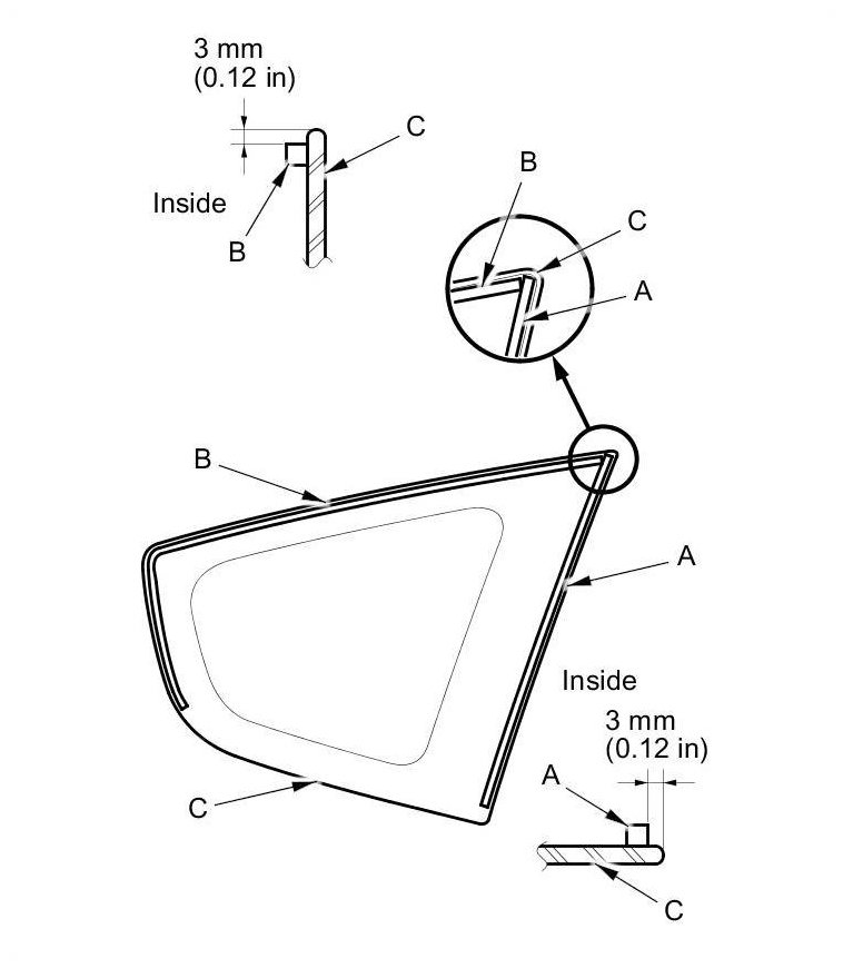 10. Attach rubber dam A and rubber dam B with adhesive tape to the inside face of the quarter glass (C) as shown: