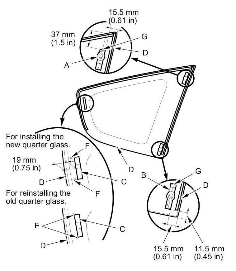 - If you are reinstalling the old quarter glass, align clip C with the alignment marks (E) you made in step 8.