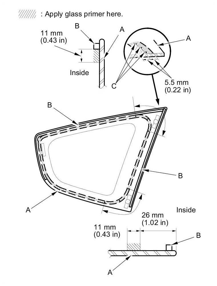 - Apply the glass primer to the corner portions of the quarter glass, using the printed dots (C) on the quarter glass as a guide.