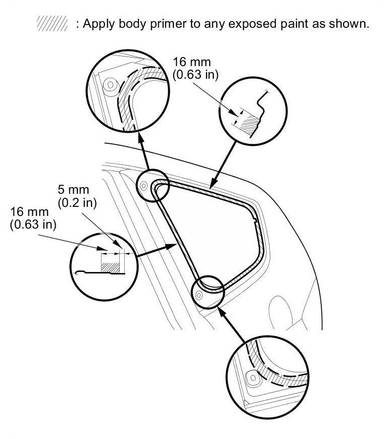 13. Apply a light coat of body primer to any exposed paint or metal around the flange where new adhesive will be applied. Let the body primer dry for at least 10 minutes: