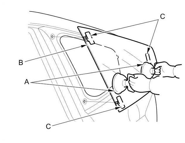 16. Use suction cups (A) to hold the quarter glass (B) over the opening, align it with the clips (C) and set it down on the adhesive. Lightly push on the quarter glass until its edges are fully seated on the adhesive all the way around.
