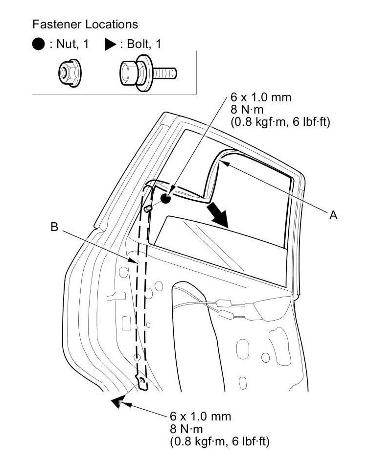 5. Pull the glass run channel (A) away as needed. Loosen the nut, and remove the bolt securing the rear lower channel (B).