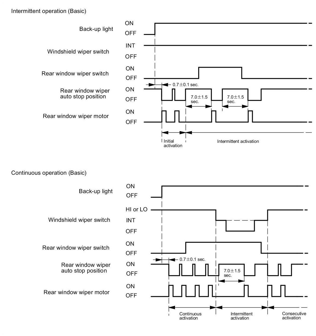 When the shift lever is shifted to R with the windshield wiper activated, the rear window wiper operates automatically even if the rear window wiper switch is off.
