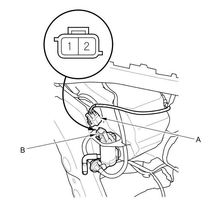 2. Disconnect the 2P connector (A) from the washer motor (B).
