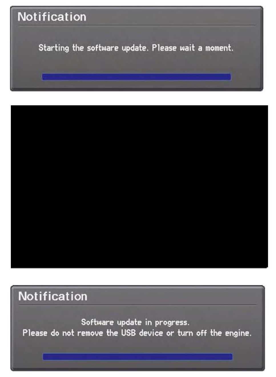 The navigation system automatically starts the update after about 1 minute, then the following screens appear. The update takes about 2 minutes.