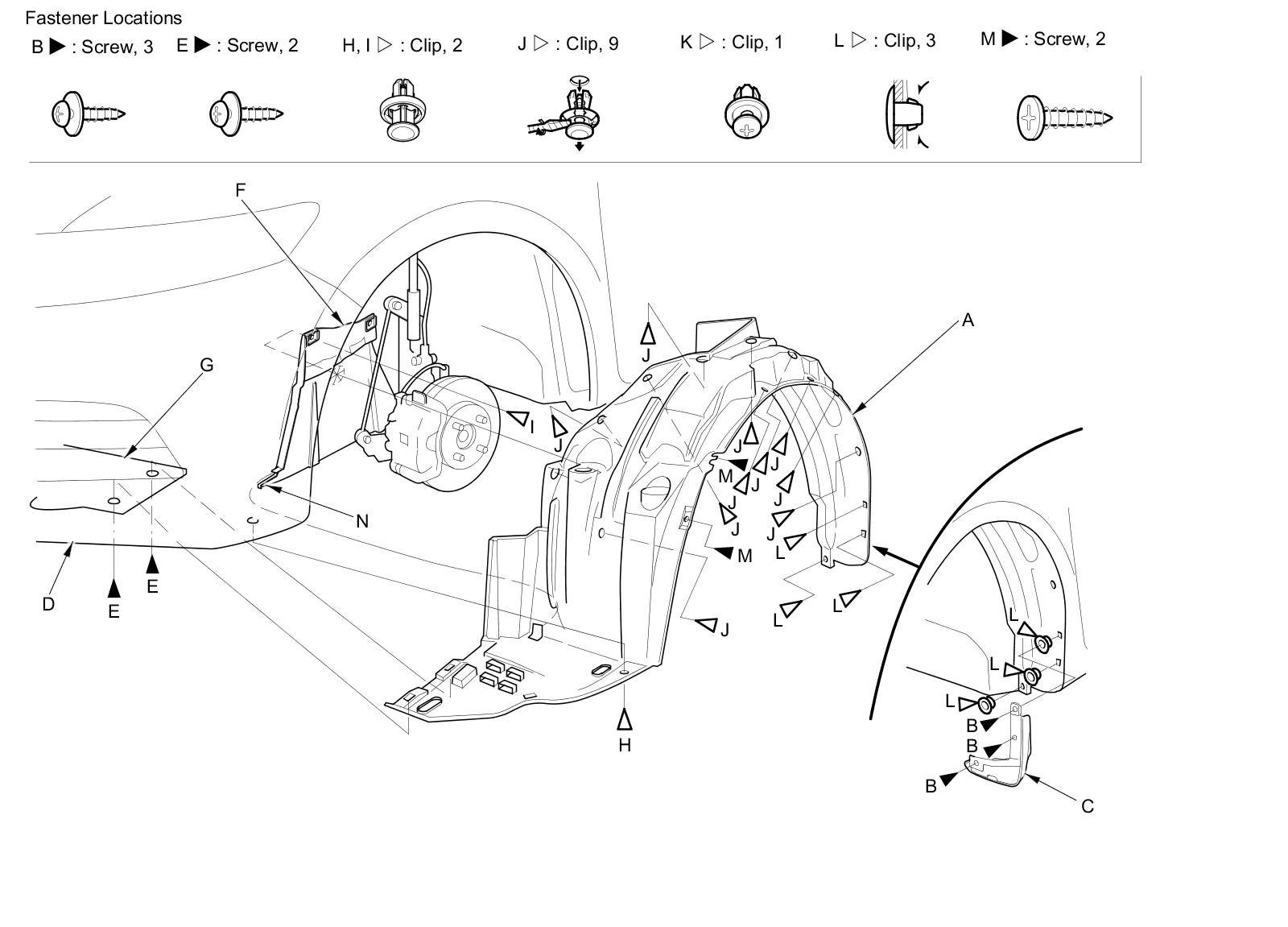 5. From the wheel arch, remove the clips (J, K, L) and the screw (M).