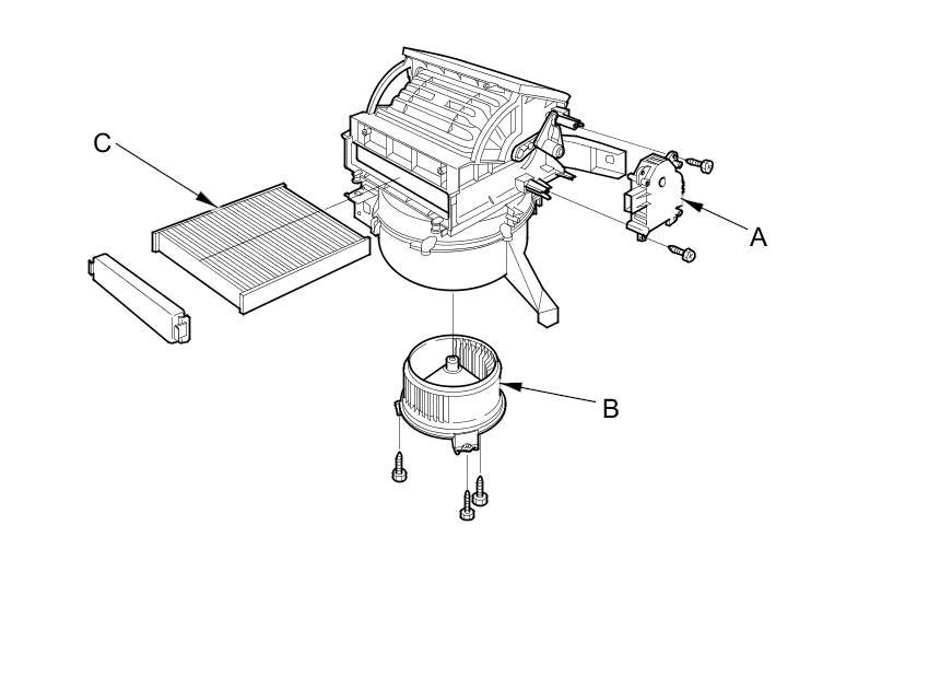 - The recirculation control motor (A), blower motor (B), and the dust and pollen filter (C) can be replaced without removing the blower unit.