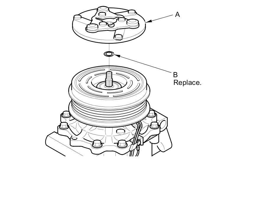 1. Remove the center nut while holding the armature plate (A) with the A/C clutch holder (B).