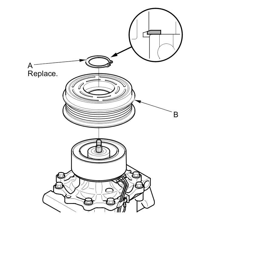 3. If you are replacing the field coil, remove the snap ring (A) with snap ring pliers, then remove the rotor pulley (B). Be careful not to damage the rotor pulley and A/C compressor.